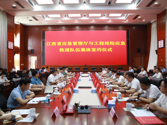 簽約儀式上,宣讀組建“江西省工程搶險應急救援隊伍”和授牌“江西省應急搶險救援潛水隊”的決定;與中國安能第二工程局簽訂《應急救援合作協(xié)議》,向省礦山救護總隊和應急搶險救援潛水隊授牌,并與江西煤業(yè)礦山救護總隊、中電建江西水電工程局、中建股份江西分公司、中建五局江西分公司、江西水投建設集團、江水建設集團、三一重工等企業(yè)互換《災害事故應急救援聯(lián)動工作機制》文本;9家企業(yè)和單位代表發(fā)言。